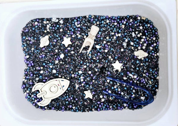 Stel je voor: een ruimtebasis gebouwd van gekleurde speelrijst en pasta, waar houten astronauten en planeten hun avonturen beleven. Misschien wordt er zelfs een geheime missie uitgevoerd met glinsterende harssteentjes! De mogelijkheden zijn eindeloos wanneer fantasie en zintuiglijk spel samenkomen.