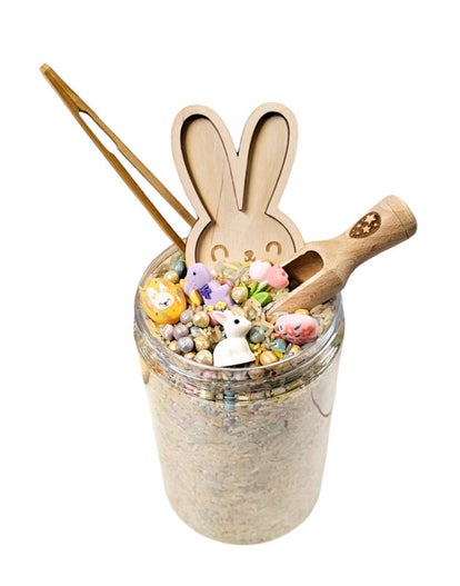 Stel je voor: je giet de pot leeg in de speelbak en een bonte mix van geverfde kikkererwten, kleurrijke speelrijst en prachtige figuurtjes komt tevoorschijn. Je kind kan vormen vullen met het houten schepje, sorteren met de pincet en zelf een fantasiewereld creëren. Misschien bouwen jullie wel een lentetuin met konijntjes of maken bloemenbedden van harssteentjes.